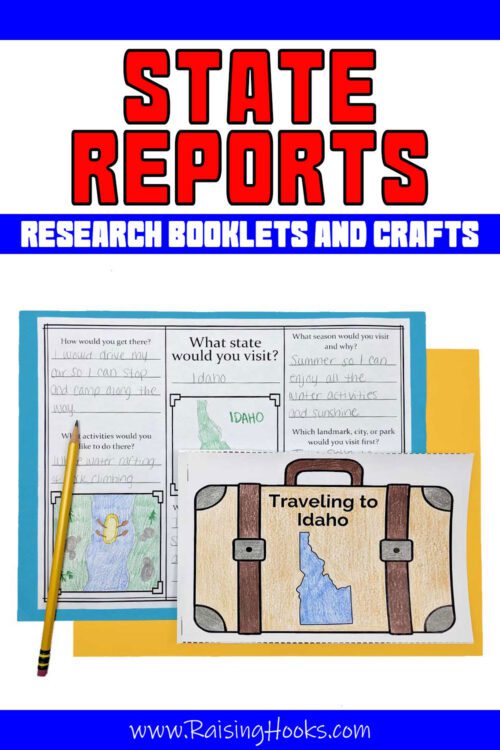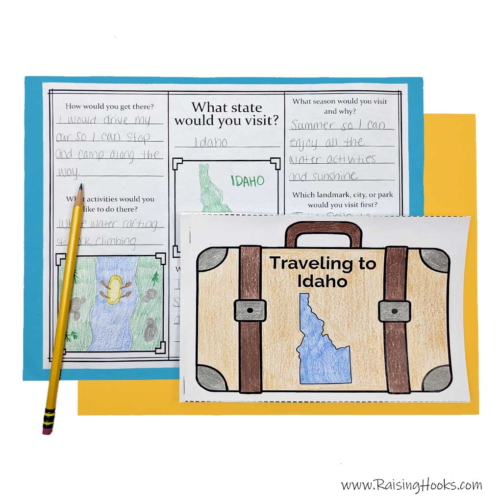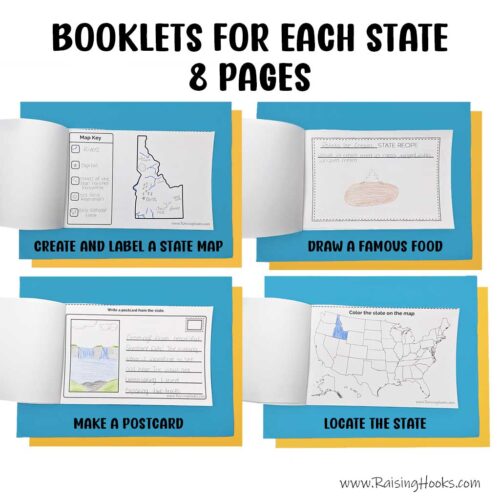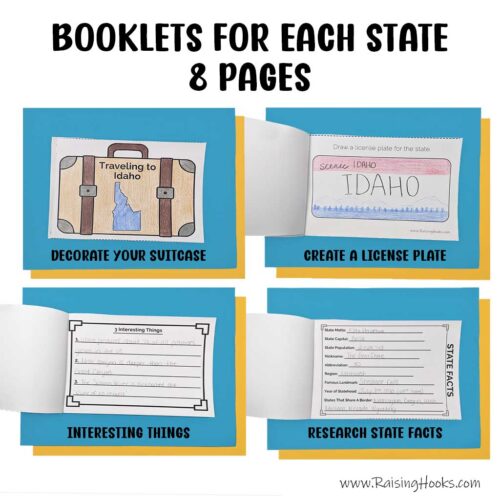 Each State Booklet includes 8 pages that help kids explore each state through creativity and research. Activities include decorating a Traveling to “State” suitcase cover, drawing and labeling a state map, drawing a famous state food, locating the state on a USA map, designing a postcard, completing a state facts research page, writing three interesting facts learned, and creating a custom state license plate.