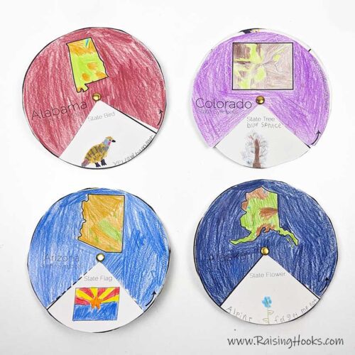 Each state comes with a state symbols wheel where kids can draw the state bird, tree, flag, and flower, color the state on the cover, and then cut it out to create a wheel that shows each symbol as it spins.