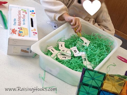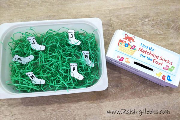 If you’re looking for a fun, hands-on way to work on letter recognition, this Fox in Socks inspired sensory bin is a huge hit!