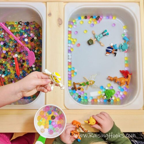 Even though this bin used a messier base, the concept is what matters. Adding small toys to “rescue” gives kids a purpose and keeps them engaged longer. You can easily recreate this idea using low-mess materials like pom poms or fabric scraps for a much easier cleanup. Pictured with the Flisat sensory bin table.