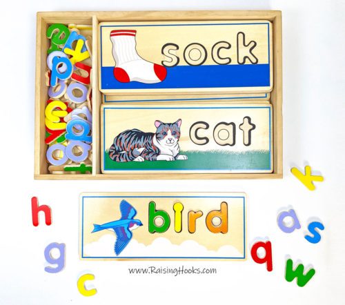 Puzzles are great for learning the alphabet. My favorite is Melissa & Doug Jumbo ABC Wooden Puzzle. The letters are simple and the base has pictures for each letter. The hands on approach helps children retain the information and focus on each letter. Plus, it’s more fun! Talk about words that start with each letter and emphasize what sound each letter makes as you place it.